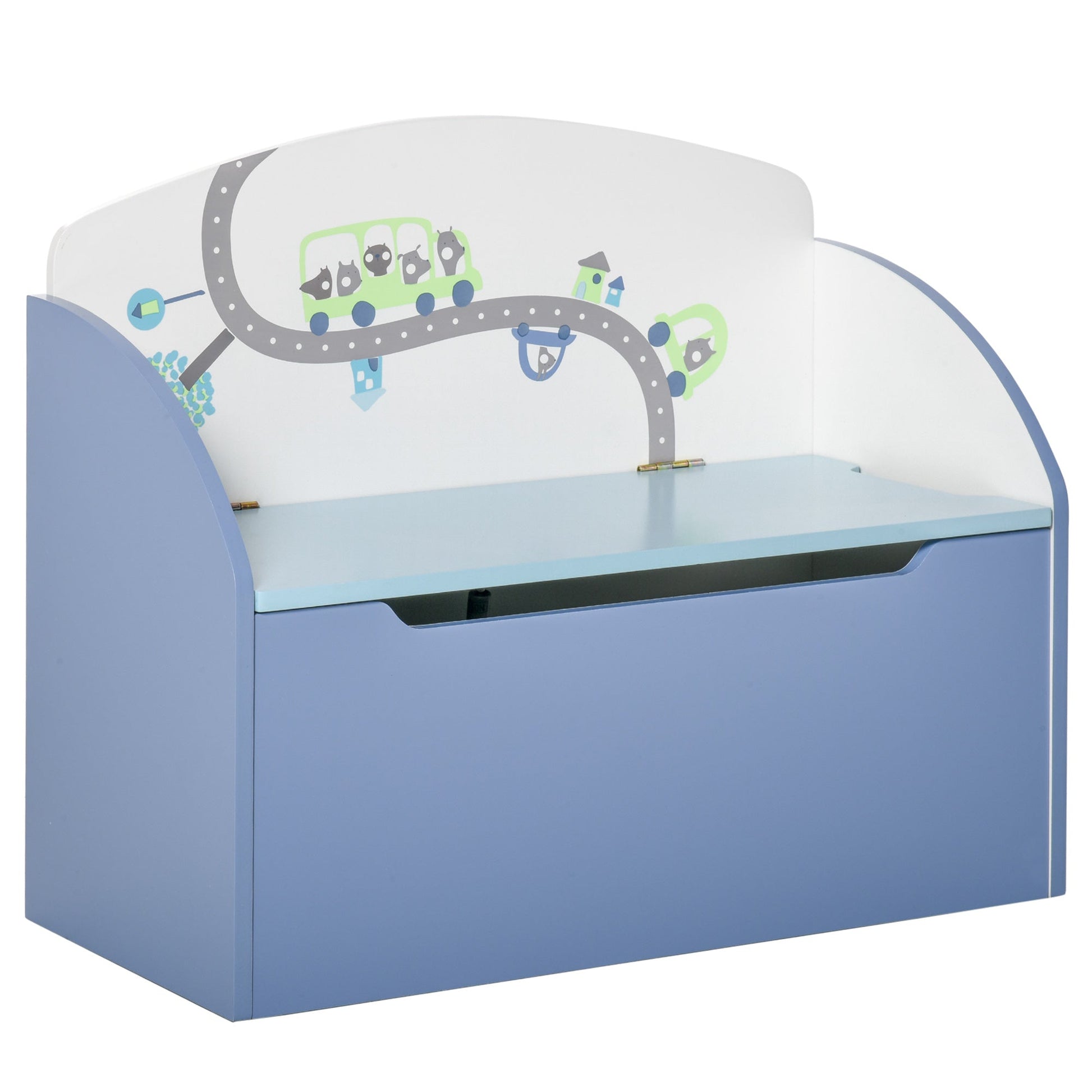 Give kids the perfect place for storage of all their belongings - go for this kids storage box bench It's a cool design - multi-tones of blue, with animals in cars on the road - meaning they'll really appreciate it and love looking after it. The lid is fitted with a gas rod that opens and closes smoothly and holds it open for safety. It can also be used as a temporary bench if needed. Fun, stylish and helpful - it's everything kids want.